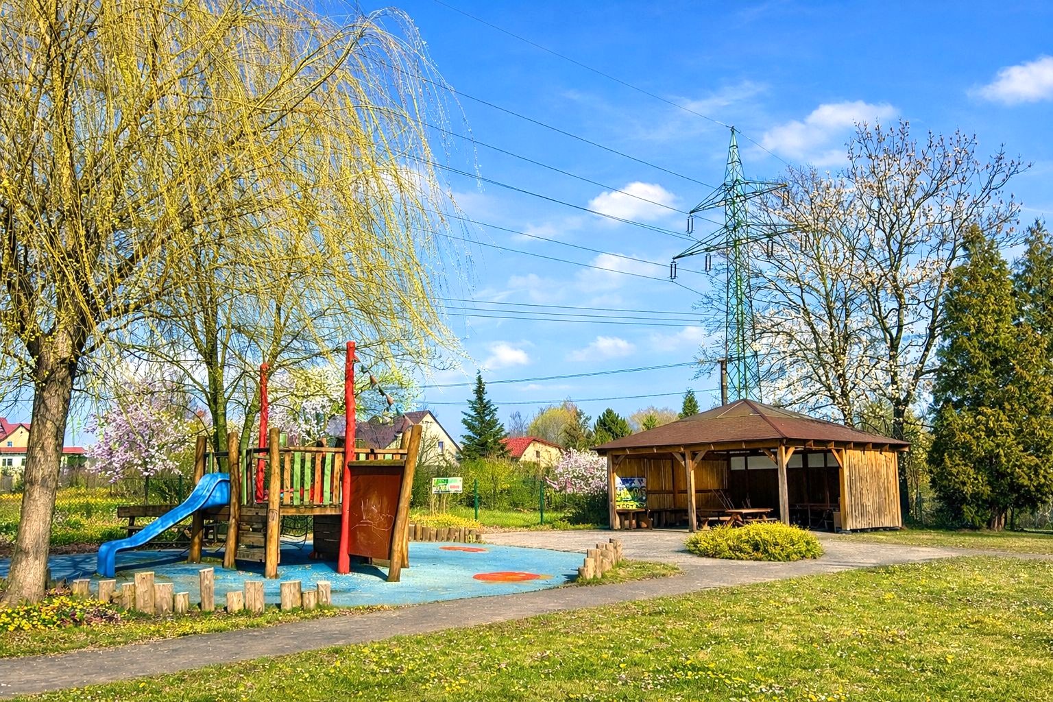 Naše školní zahrada je příjemným a bezpečným místem pro každodenní hry, pohyb i objevování přírody. Děti zde využívají herní prvky podporující rozvoj pohybových dovedností, rovnováhy a spolupráce. Součástí zahrady je také zastřešené posezení, které umožňuje realizovat aktivity venku za každého počasí. Zahrada nabízí dostatek prostoru pro volnou hru, společné činnosti i odpočinek v přírodním prostředí. Děti zde pozorují proměny ročních období, učí se vztahu k přírodě a tráví velkou část dne na čerstvém vzduchu, což podporuje jejich zdravý vývoj a radost z pohybu.