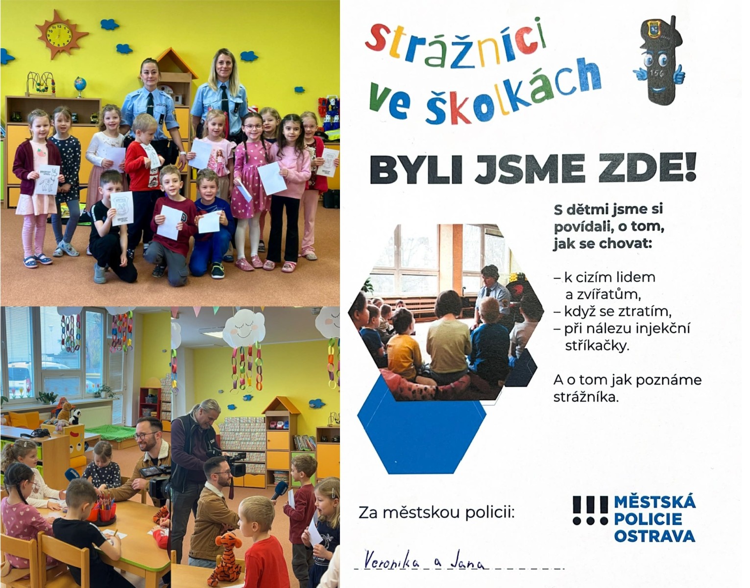 V naší mateřské škole proběhla beseda s příslušníky Městské policie Ostravy zaměřená na bezpečnost dětí. Děti se hravou formou dozvěděly, jak se správně chovat při setkání s cizí osobou, co dělat při nálezu nebezpečných předmětů, například injekční stříkačky, a jak reagovat při setkání se psem nebo v situaci, kdy by se cítily ohrožené. Beseda byla velmi přínosná a děti se aktivně zapojovaly do povídání i modelových situací. Získaly tak důležité informace, které jim pomohou lépe se orientovat v běžných i rizikových situacích. Při této příležitosti naši mateřskou školu navštívila také televize Polar, která celou akci natáčela.