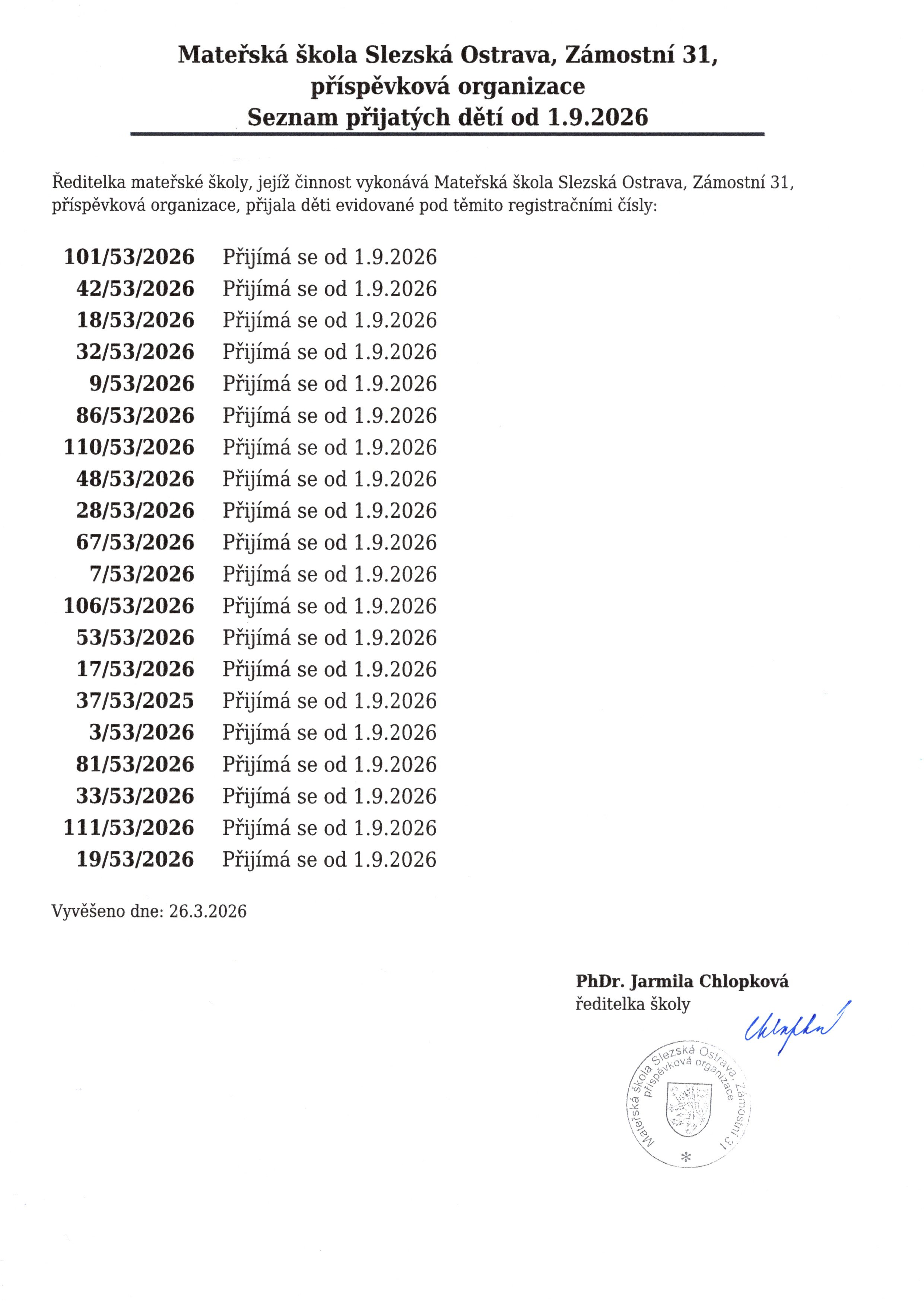 Výsledky přijímacího řízení do MŠ Slezská Ostrava, pracoviště MŠ Antošovická pro školní rok 2026/2027 - přijaté děti