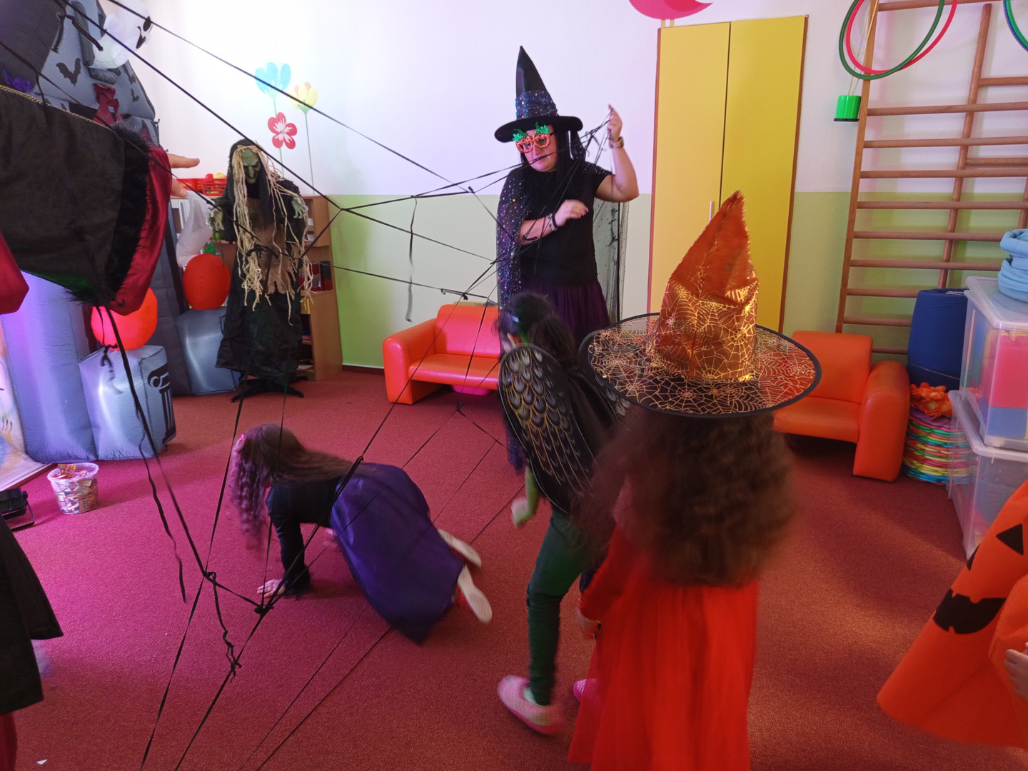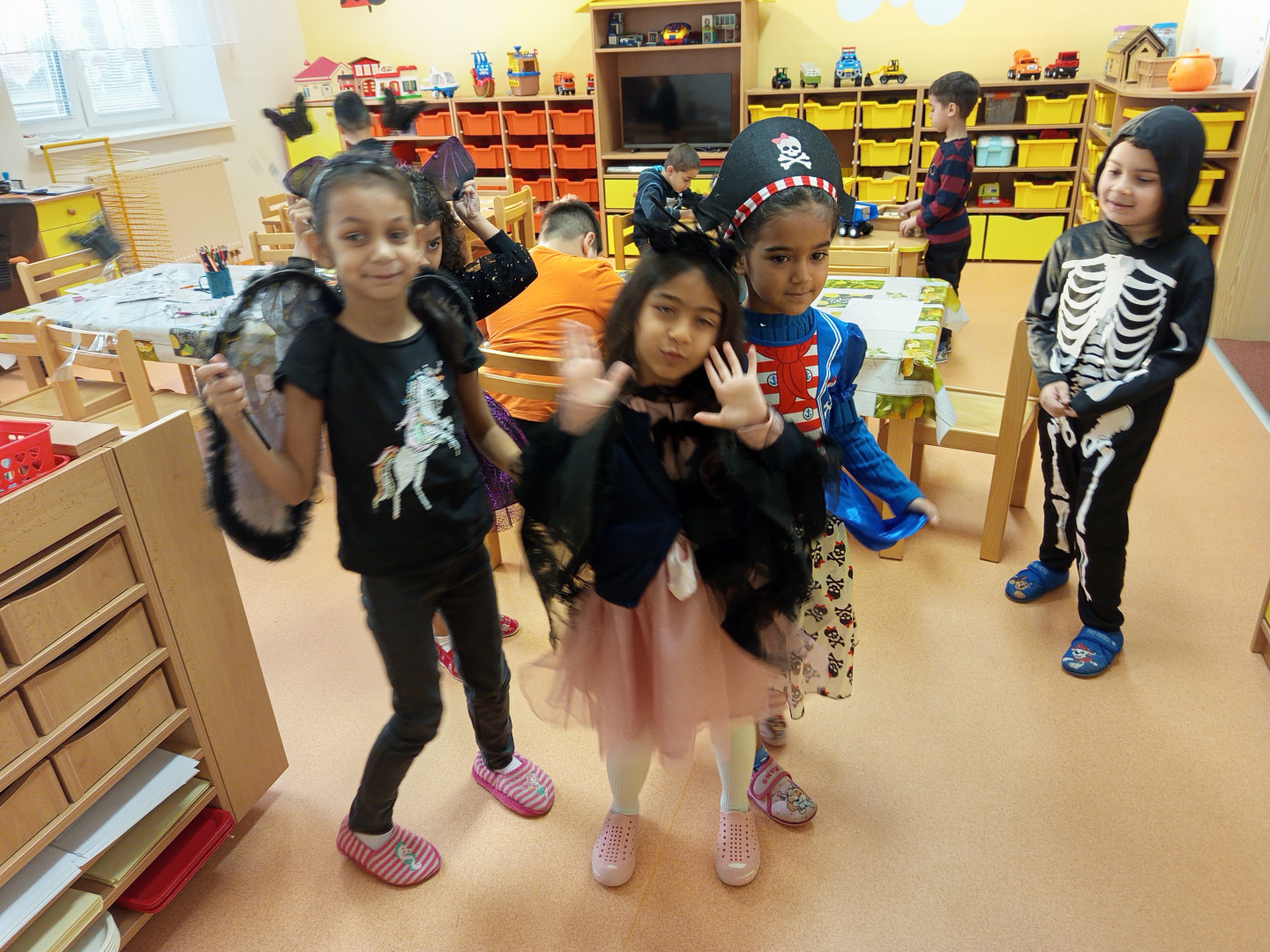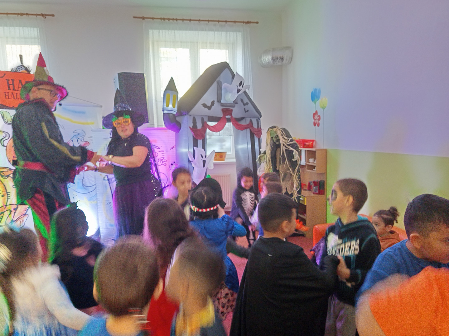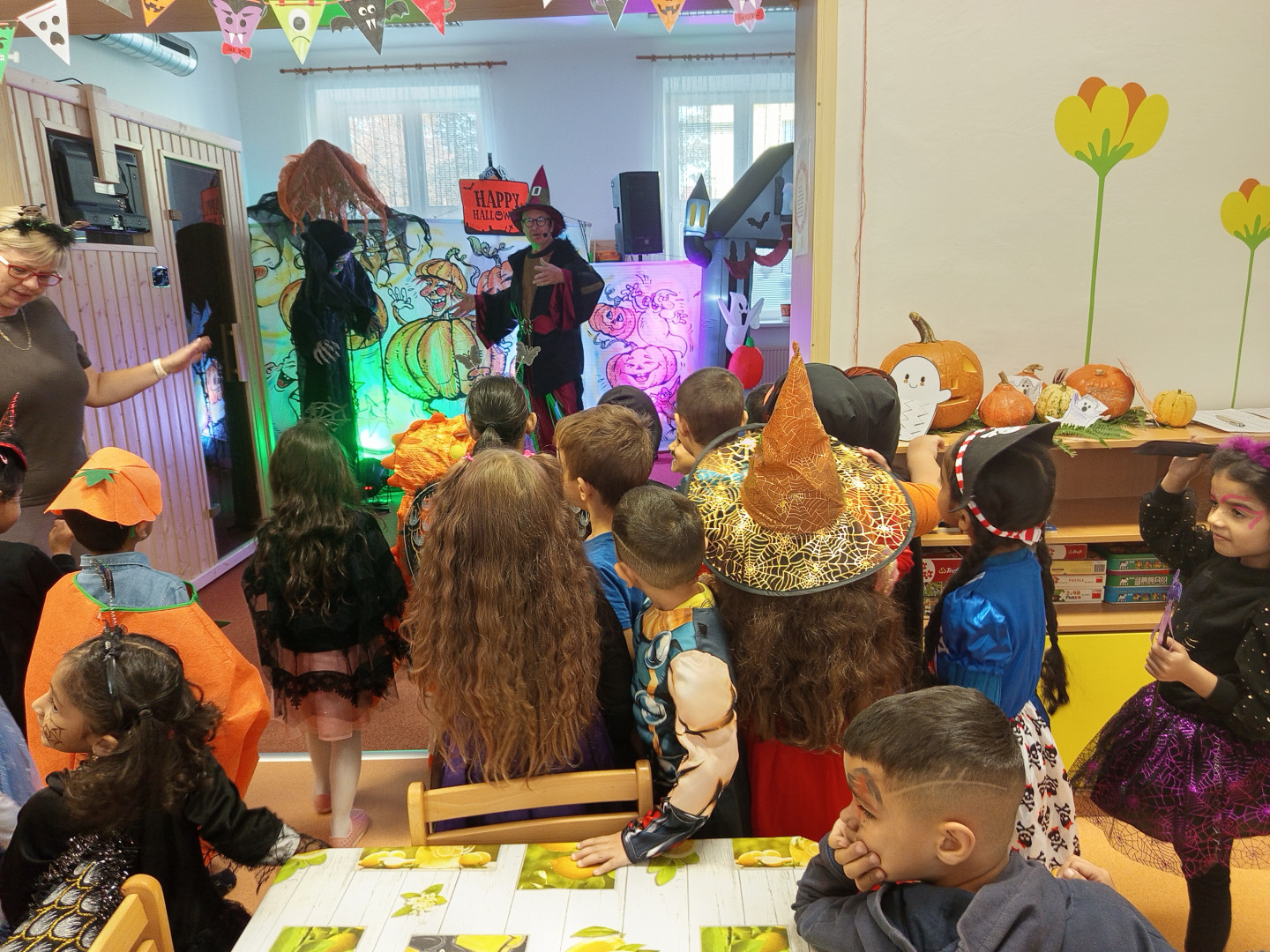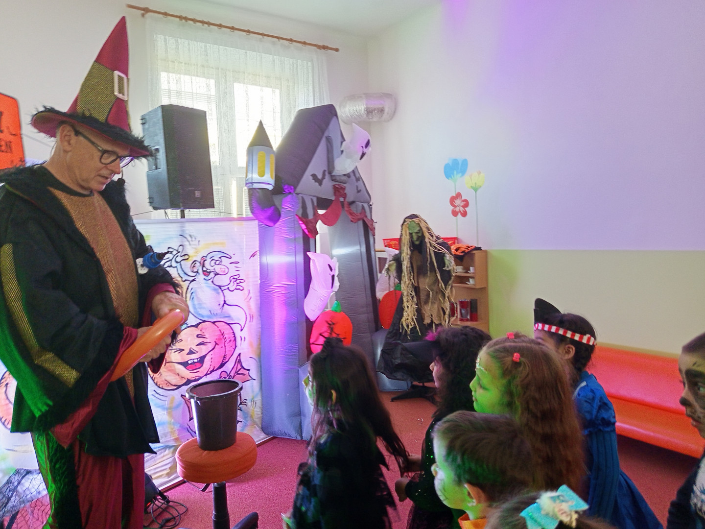 Ve středu 22. 10. jsme s dětmi prožili zábavné dopoledne s klaunem Hopsalínem, který za námi přijel s Halloweenským programem. Hned po svačince na nás čekal čaroděj spolu s čarodějnicemi dole v herně, která byla vyzdobená na Halloweenskou párty. Děti celé dopoledne tančily Halloweenské tanečky a hrály zábavné hry a soutěže jako třeba nošení dýničky na ruce kostlivce kolem čarodějnice. Všichni nakonec dostali zaslouženou odměnu v podobě Halloweenských sladkostí a barevného balónku od Hopsalína.