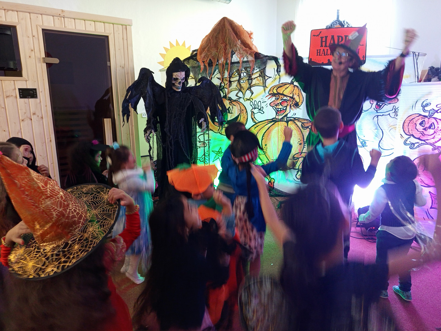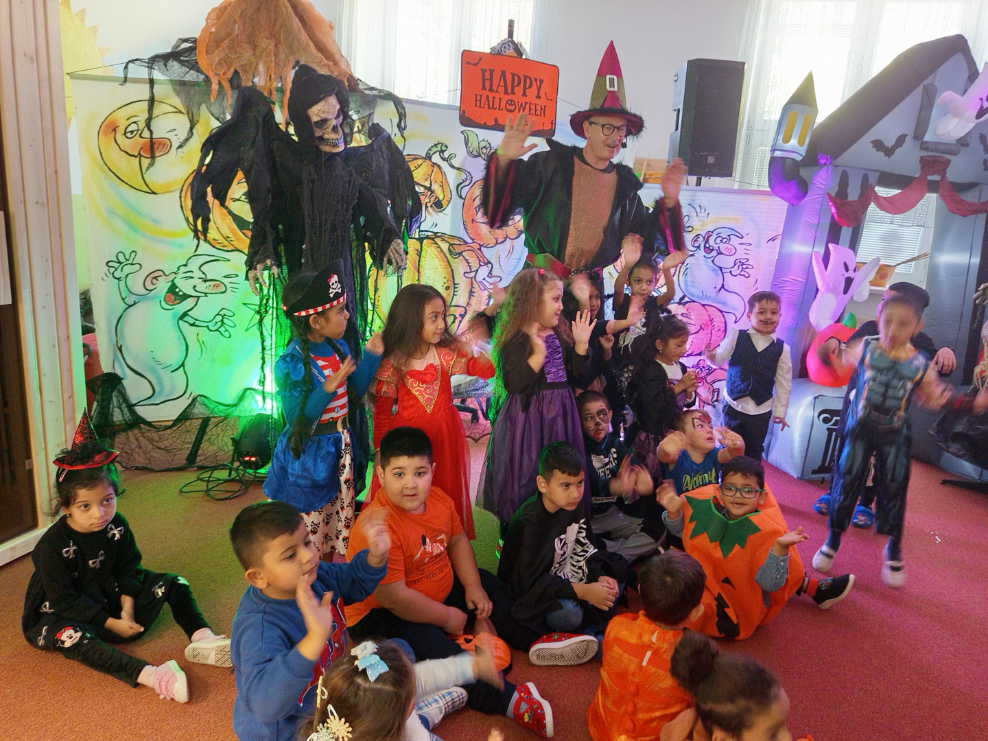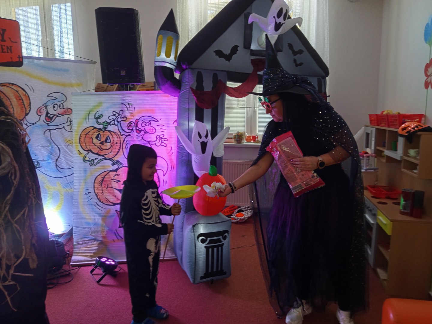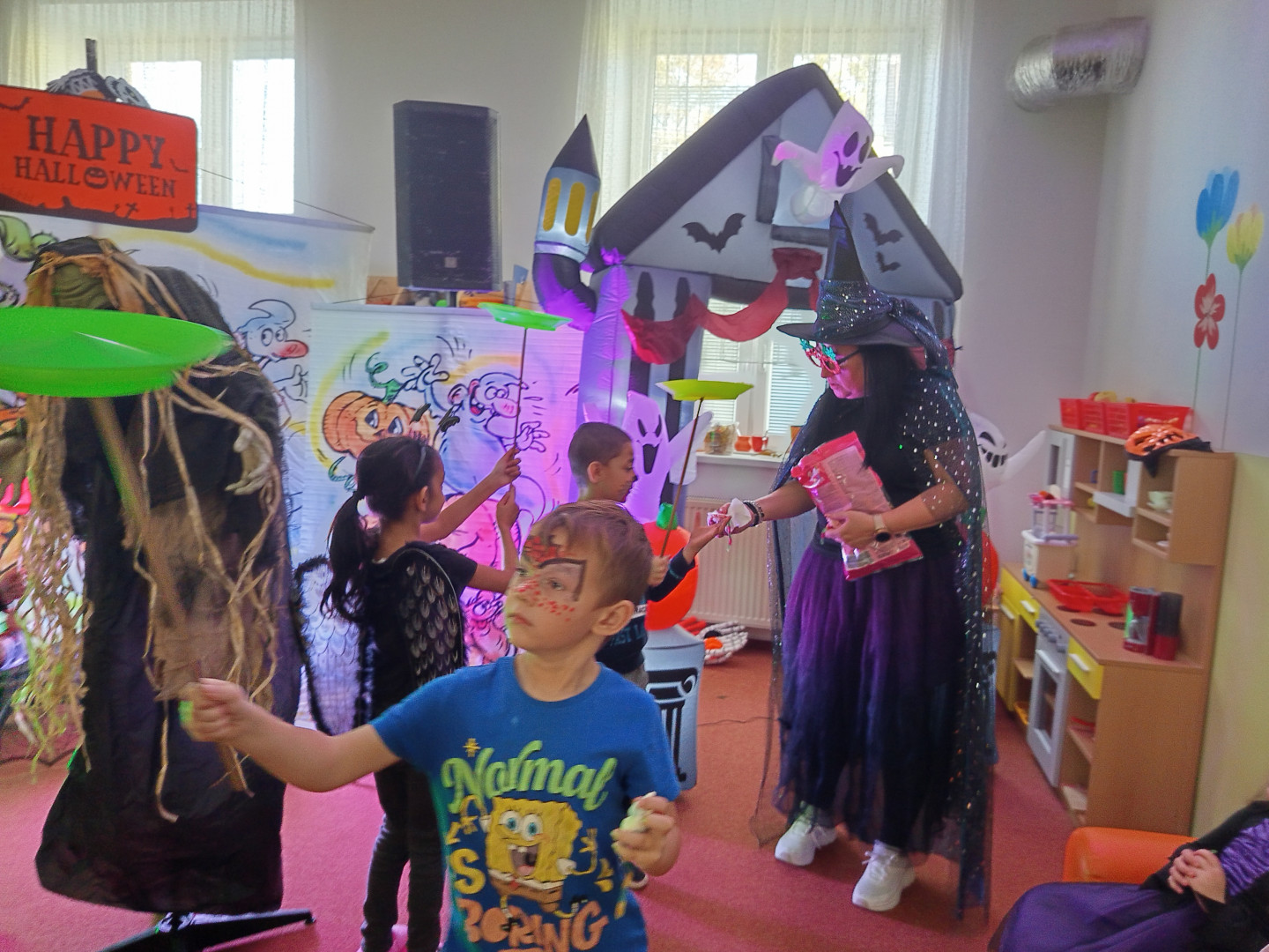 Ve středu 22. 10. jsme s dětmi prožili zábavné dopoledne s klaunem Hopsalínem, který za námi přijel s Halloweenským programem. Hned po svačince na nás čekal čaroděj spolu s čarodějnicemi dole v herně, která byla vyzdobená na Halloweenskou párty. Děti celé dopoledne tančily Halloweenské tanečky a hrály zábavné hry a soutěže jako třeba nošení dýničky na ruce kostlivce kolem čarodějnice. Všichni nakonec dostali zaslouženou odměnu v podobě Halloweenských sladkostí a barevného balónku od Hopsalína.